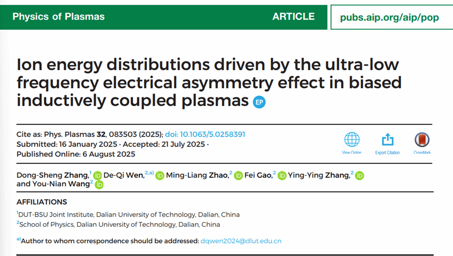 近日,我校中白学院2022级本科生张东升在偏压感性耦合等离子体离子能量调控的研究工作被国际等离子体物理领域主流期刊Phys. Plasma发表,并被编辑选为Editors’ Pick, 在杂志主页专栏刊载。论文题目为 “Ion energy distributions driven by the ultra-low frequency electrical asymmetry effect in biased inductively coupled plasmas”,其中张东升为第一作者;安博anbo(中国)的温德奇教授为通讯作者;安博anbo(中国)赵明亮博士后、高飞教授、张莹莹高级工程师和王友年教授为共同作者。
